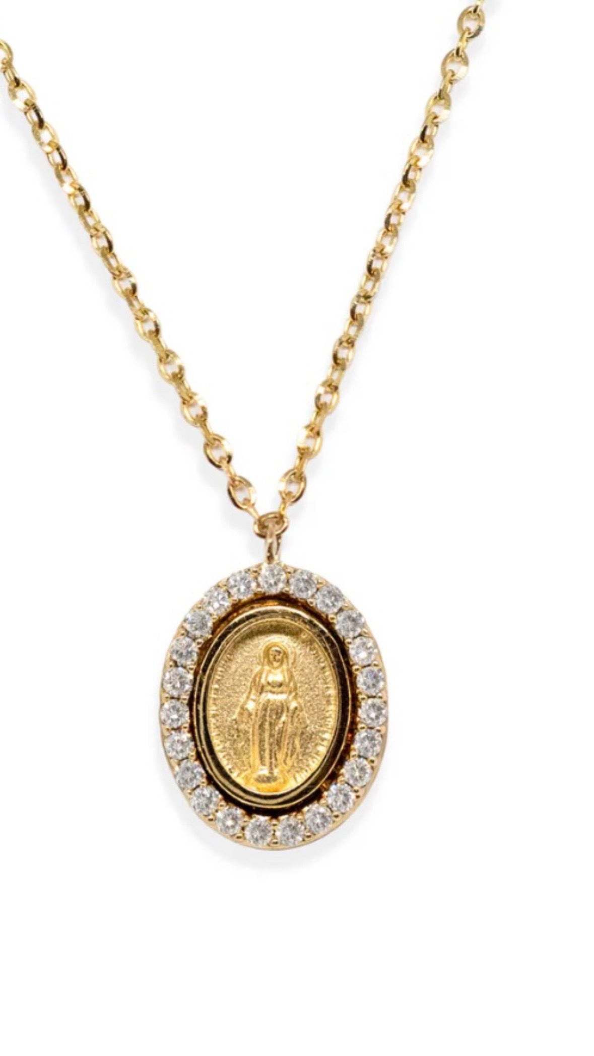 Crafted in solid 14K gold, this Miraculous medal is a classic, accented with a frame of petite full cut diamonds with a total weight 0.14cts The medal's measurements with the diamond frame (not including the bail) are 10.50mm (L) X 8.70mm(W). The medal in the center of the frame is 14 karat yellow gold and it's measurements are 8.0mm (L) X 6.0mm (W). The medal is mounted on a thin diamond cut cable chain which measures 18'' inches in length with a jumper ring at 17' and 16 inches to shorten it. This necklace is available in 14K Yellow