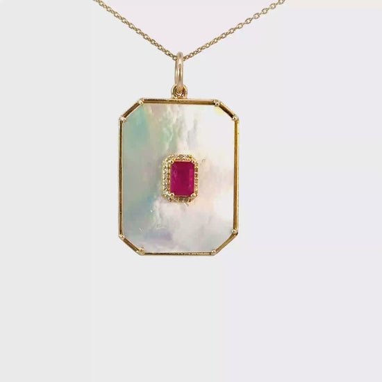 14K Yellow gold Square Pendant Wt. Mother Pearl, Ruby & Natural Diamond
