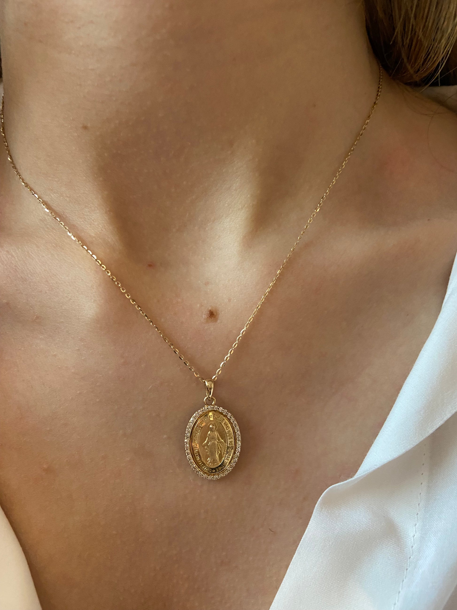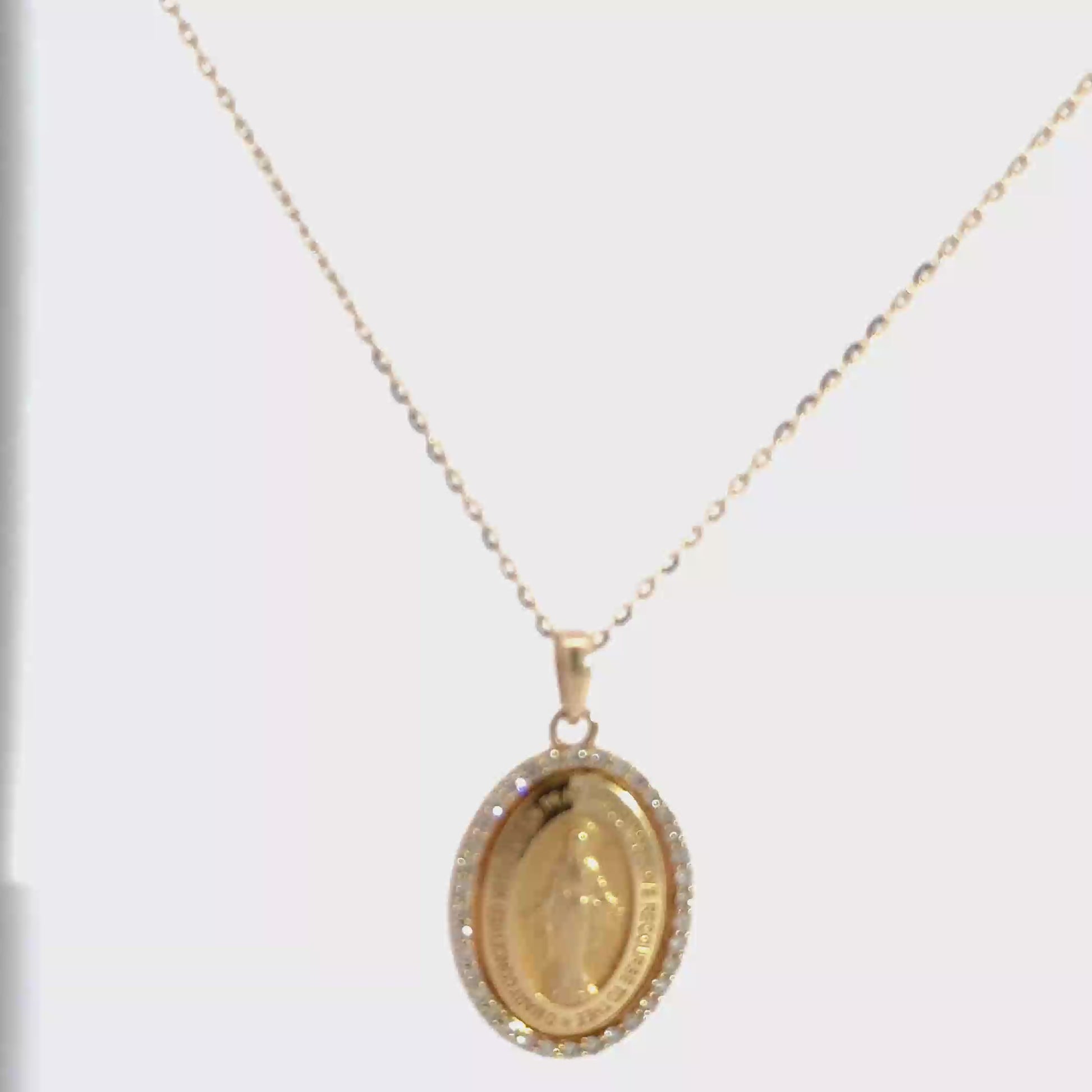 Spectacular and beautiful, Miraculous Medal (24.0mm X 18.0mm) surrounded with petite diamonds with a total weight of 0.49ct on a diamond cut cable chain 18 inches in length with jumper rings at 17 and 16 inches to shorten the necklace. Crafted in 14 Karat Solid Gold.