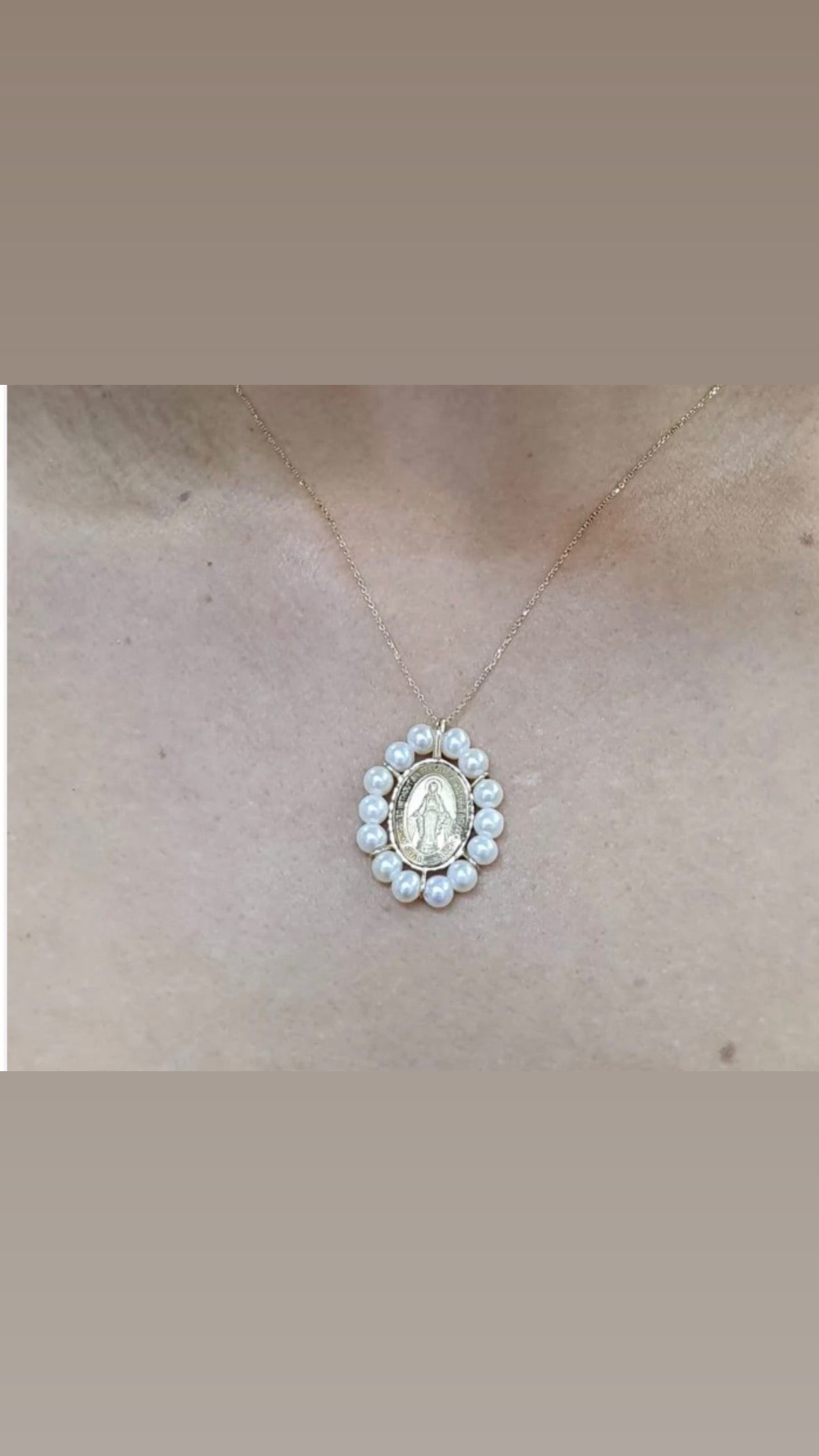 Miraculous Medal in 14 karat gold mounted on a halo, frame, of fresh water pearls (4.5mm). Center Guadalupe Medal's dimensions are 15mm X 10mm, and the overall dimension's of the medal 25mm X 21mm.