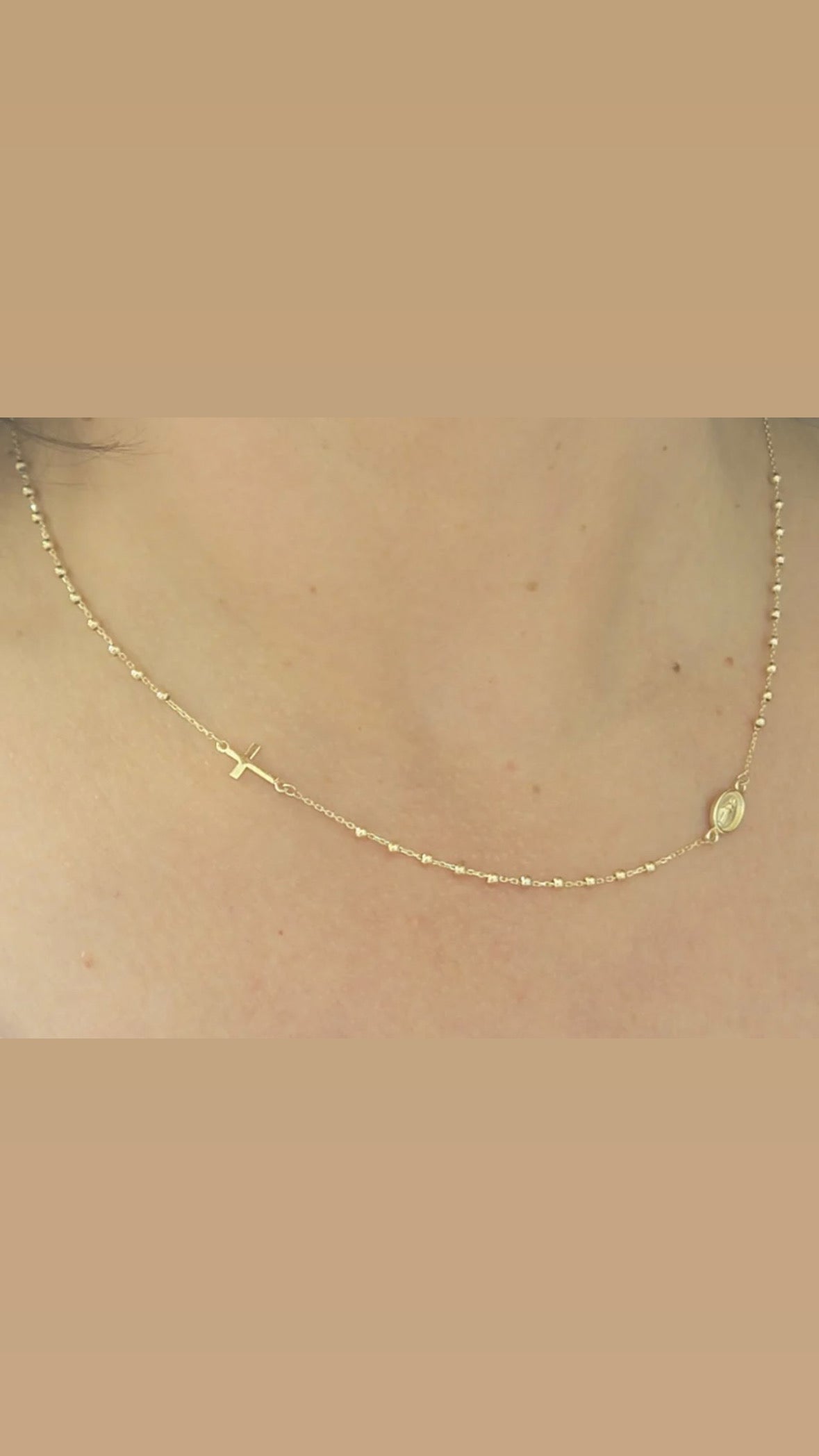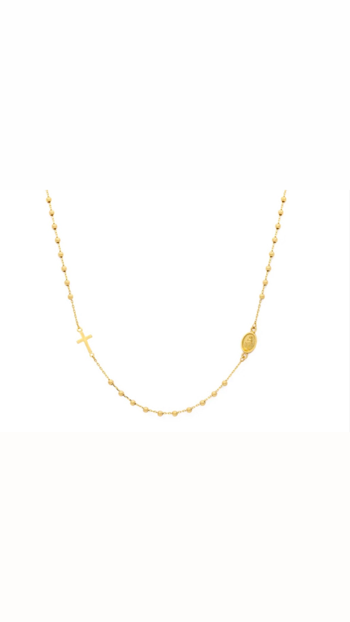 Subtle, close to the neck rosary necklace crafted in 14K Yellow Gold. This is a full rosary but it is 17" inches. Balls measure 2.0mm each. The miniature Miraculous medal measures 7.0mm x 5.7mm and the cross measures 8.0mm x 6.0mm.