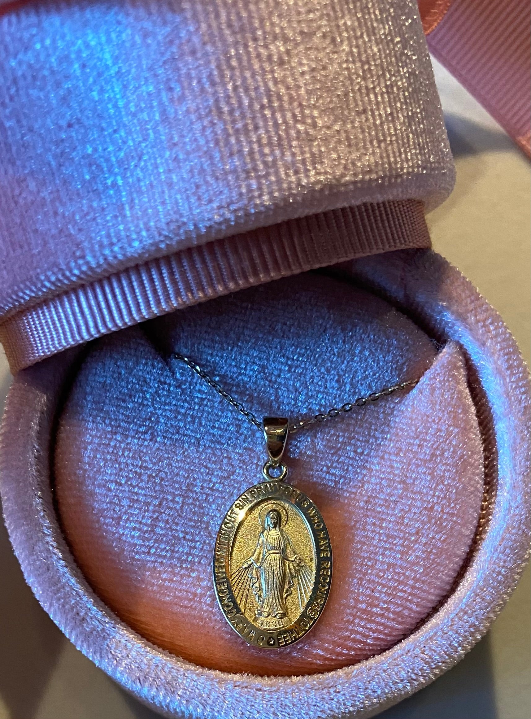 Beautifully crafted oval, Miraculous Medal (15mm X 10mm) makes the perfect gift for the religiously devout. Beautiful medal commemorating our Blessed Mother. This medal is Medium Large.